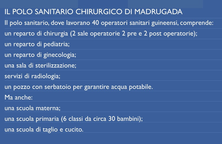 Obiettivo numero due: salvaguardare la corretta conservazione dei dispositivi sanitari e farmaci (prodotti dal laboratorio farmaceutico per garantire un prezzo più basso e renderli accessibili a tutti), ma buttati via perché andati a male a causa del cattivo funzionamento della catena del freddo. Obiettivi raggiunti grazie all’installazione di un impianto fotovoltaico stand alone da 12 kW donato da Seva for Africa al polo sanitario-chirurgico gestito dalla cooperativa Madrugada di Bissau. Qui 40 operatori sanitari guineensi laureatisi all’estero offrono un contributo importante per battere malattie che non lasciano scampo. In molti ora possono accedere a un vaccino, a una terapia per casi di diabete scompensato o di malaria, di polmonite o di gastroenterite.