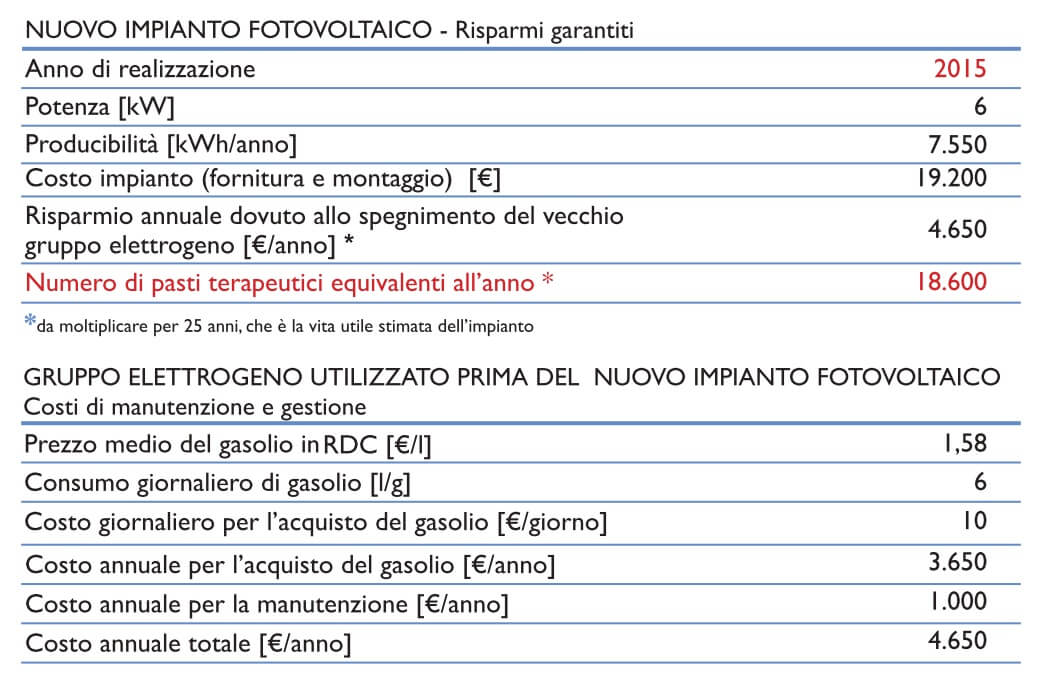 Nel pronto soccorso di Panzi (Bukavu) dal 2015 l’impianto fotovoltaico stand alone da 6 kW copre principalmente il fabbisogno di un dispensario e di un laboratorio di analisi.
